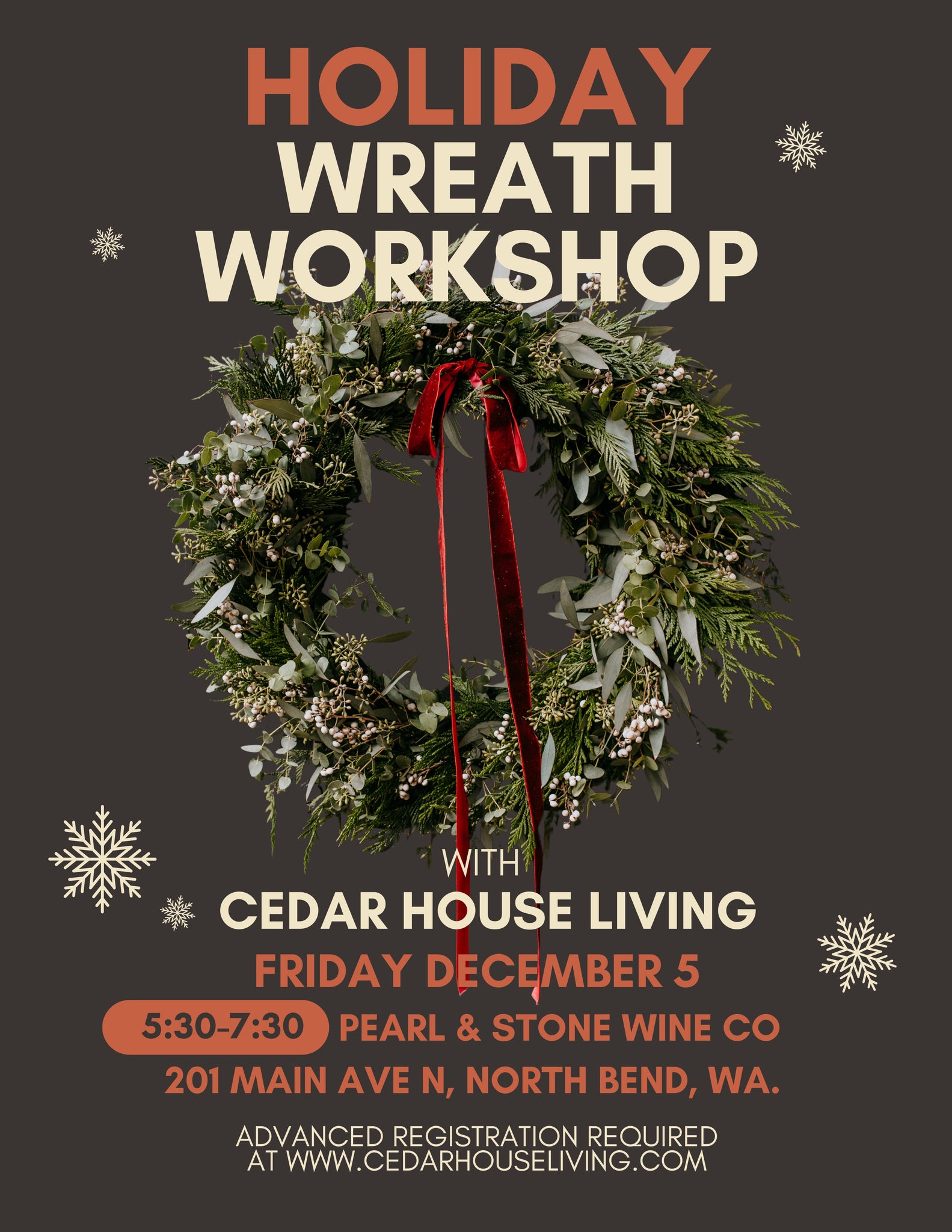 Join Cedar House Living at Pearl & Stone Wine Co. in North Bend for an evening of great wine and craft while Jess guides you through creating your own seasonal wreath with high-end fresh ingredients and. Advance registration is necessary and space is limited.