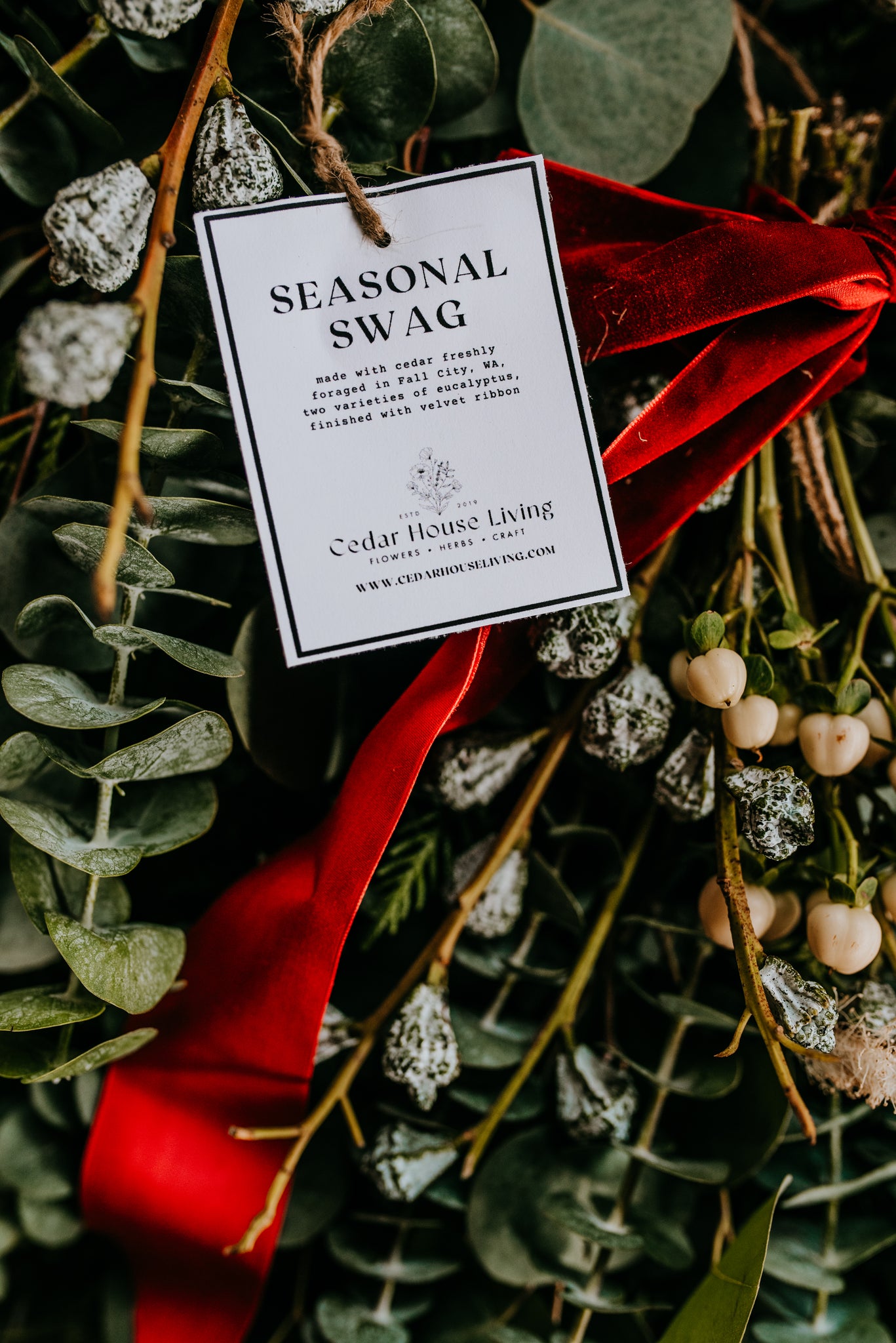 Our charming holiday swag is made of cedar freshly foraged here in the Snoqualmie Valley, and two varieties of fresh eucalyptus. It is finished with various accent ingredients and velvet ribbon. Ingredients are fresh, long-lasting, and biodegradable.